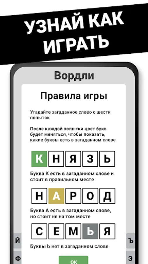 Вордли на русском это игра в слова, в которой вам за 6 попыток надо угадать слово из пяти букв. При каждой из попыток каждая буква окрашивается в определенный цвет.