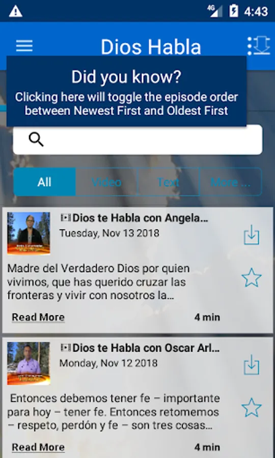 This is the most convenient way to access Dios Te Habla Hoy on your phone. With this app you are always connected to the latest episodes and the show. You can also star your favorite episodes and save them to a list so you can easily enjoy them over and over! This app is complete access to Dios Te Habla Hoy and if you're a fan of the show you won't want to be without it!
