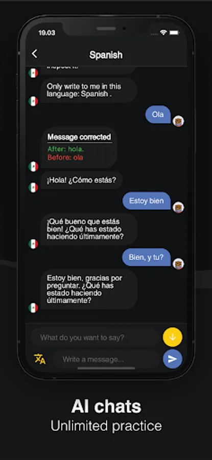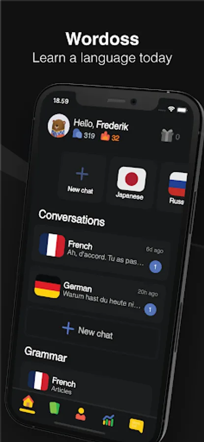 Now everyone can chat in any language, whenever they want and as much as they want. The Artificial Intelligence will keep you engaged by not only answering your messages, but by asking you questions. Don't know what to reply? No Problem! Wordoss lets you translate directly in the chat.