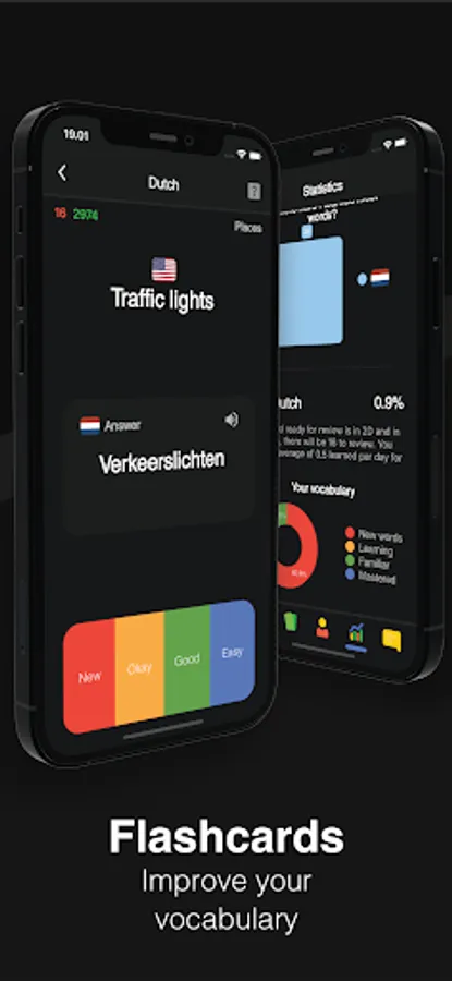 Wordoss also gives you pre-made flashcards and with statistics, you can see how you're holding up.