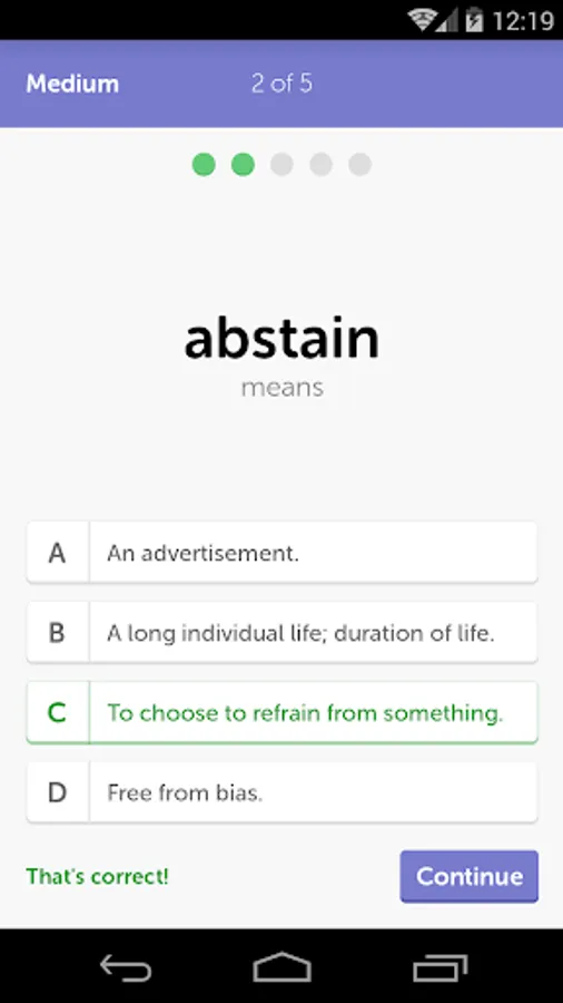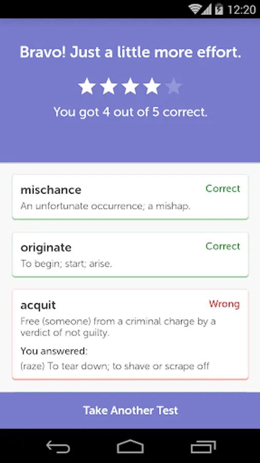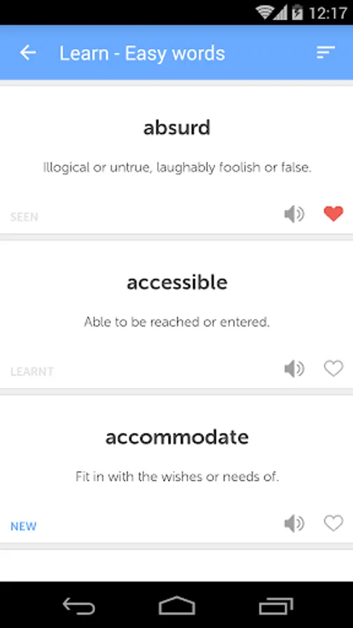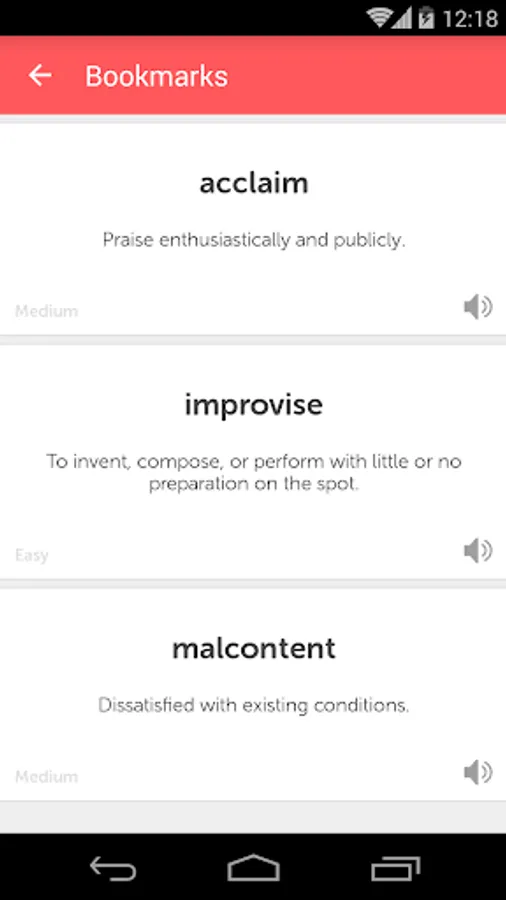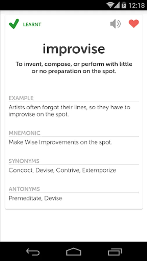 The app is essentially a deck of cards with words accompanied by memory tricks, synonyms, antonyms and usage examples. The words are divided into levels and you can always select the apt level of learning for yourself. The deck also carries an instinctive test engine that helps you solidify your learning.