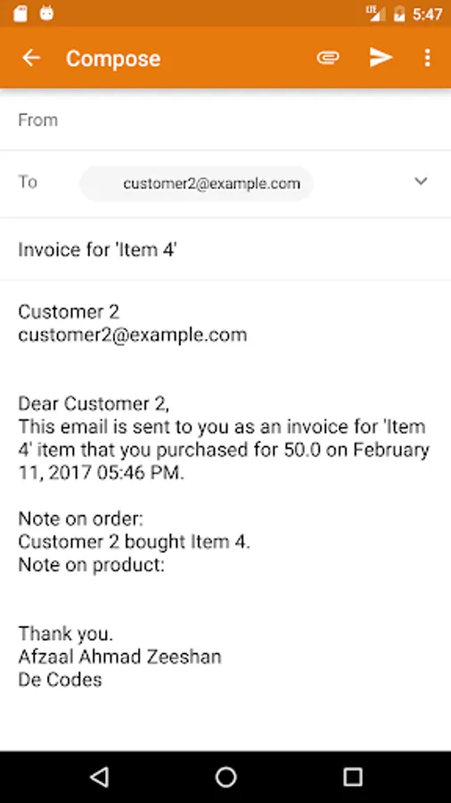 For each of the order, application provides you with a feature to simply create an email invoice that can be sent to the customer. You can always modify it and once you are happy with it, you send it using your own favorite email client. We just let you create the email with just one click and fill the sample email with the details of customer, product purchased and your own information.