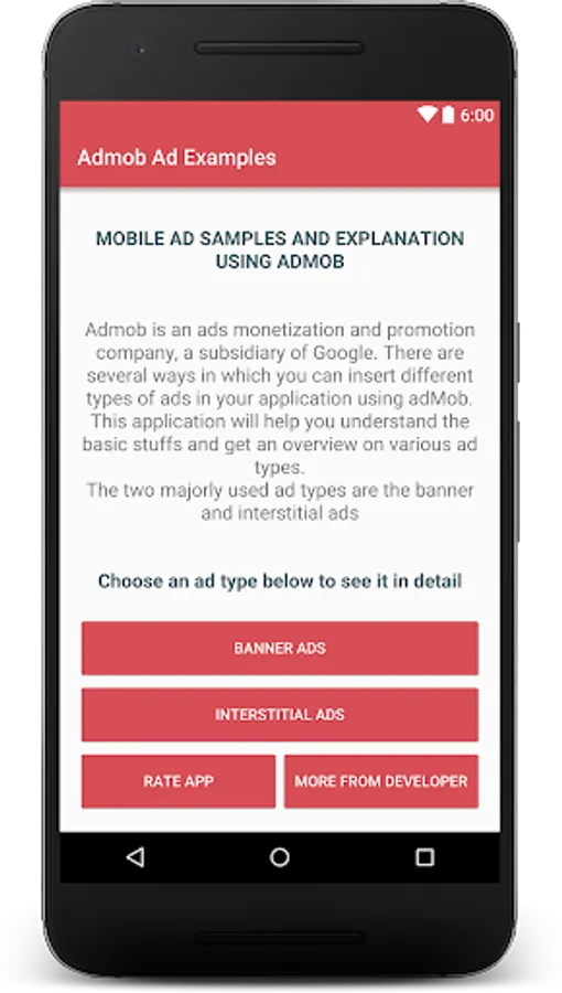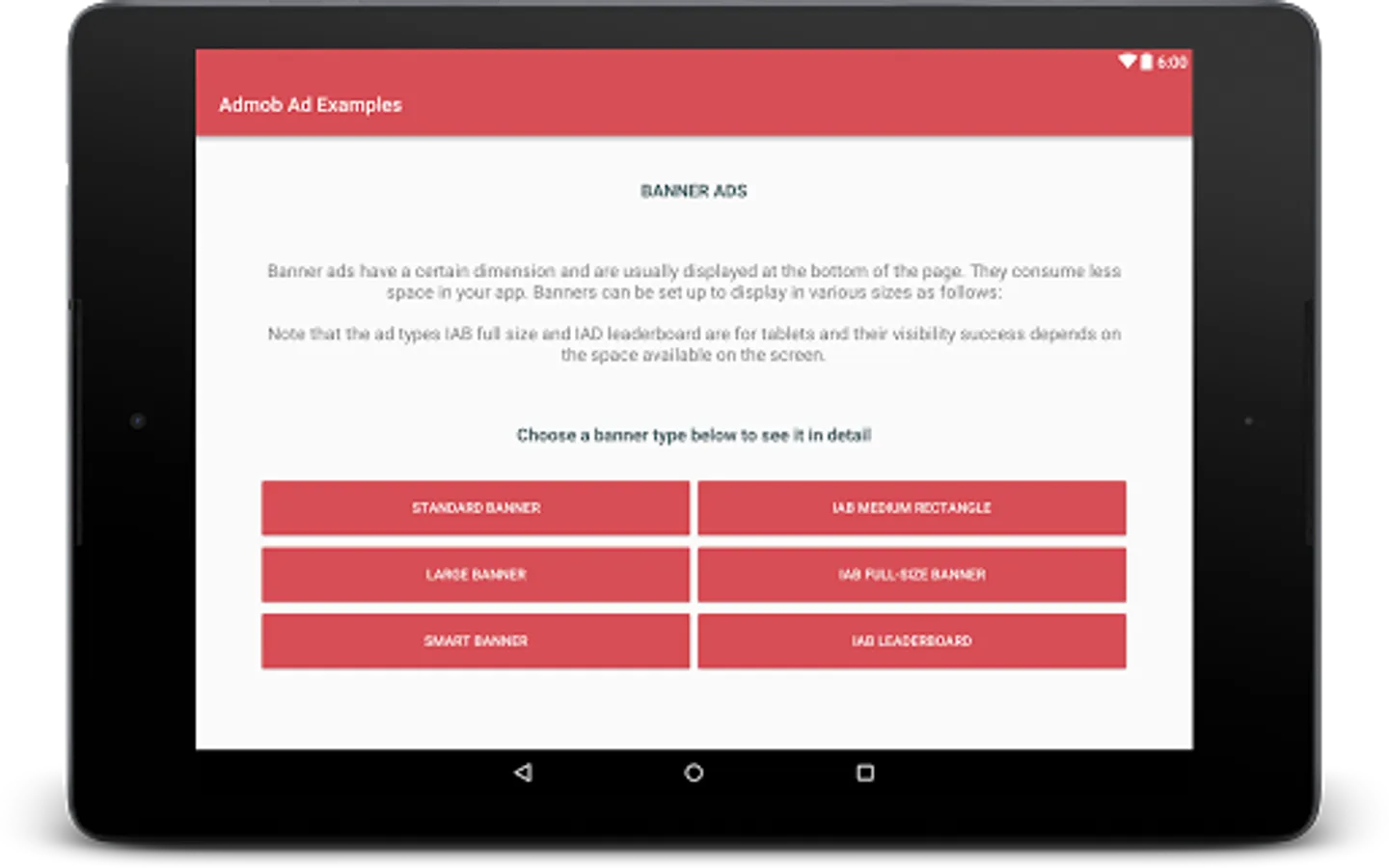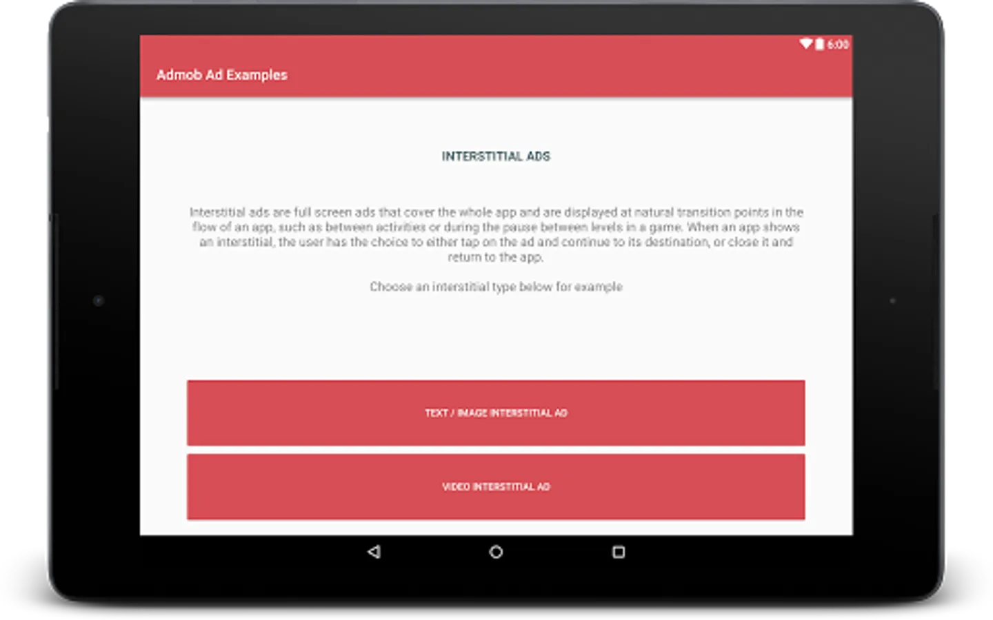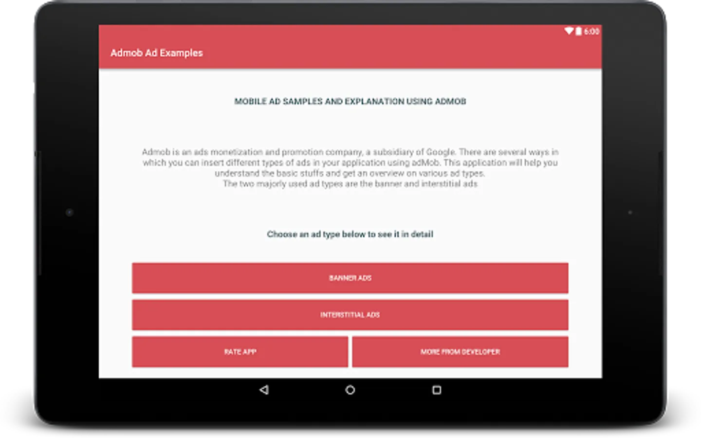 This applications explains mobile ads with example using Admob as of now. Use it as a handy guide to know what type and size of ad you need to implement in your app or game. The app uses material design and so it fairly supports all screen sizes.
