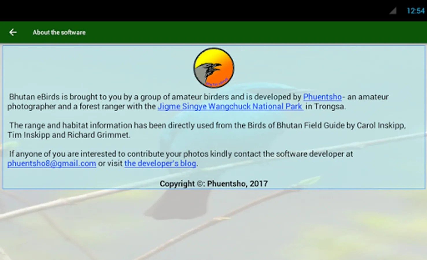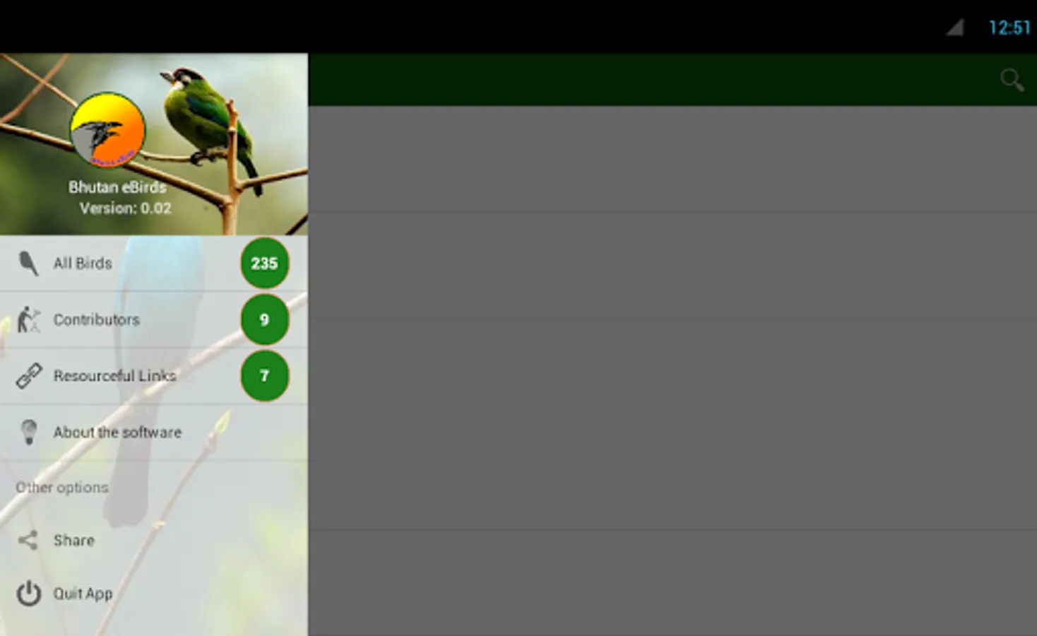 This is the first ever attempt to showcase the Bhutanese Birds in the android mobile platform. Some of the Birds found in Bhutan is shown in this application, which anyone interested in Birds and use it with ease. With such applications, I hope that more of our people will take interest in the birds of the country and thus help in the conservation and protection of our Birds and the environment as a whole.