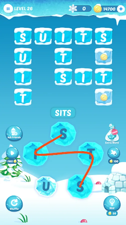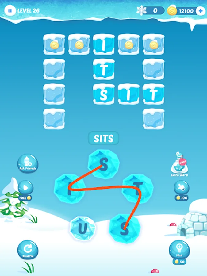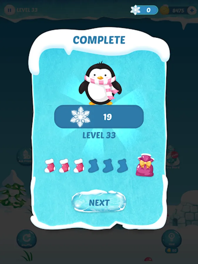 There are so many ways to get rewarded in our word game: launch the game every day to get our daily bonus coins! Meanwhile, you will get a coin pack every 6 levels; if you finish all levels of a category, you get a one-time bonus; filling in the "coin-blanks" will also get you coins. Still not enough coins? You can get snowflakes by finding the words that are not included in the answers or completing a combo in a normal level without any mistake. For every snowflake you collect you will get 4 extra coins saved to the Piggy Bank. Once the bank is full (or earlier), you can purchase a hammer to break it to get all the coins saved within. You can save 1000 coins tops in the Piggy Bank before you break it.