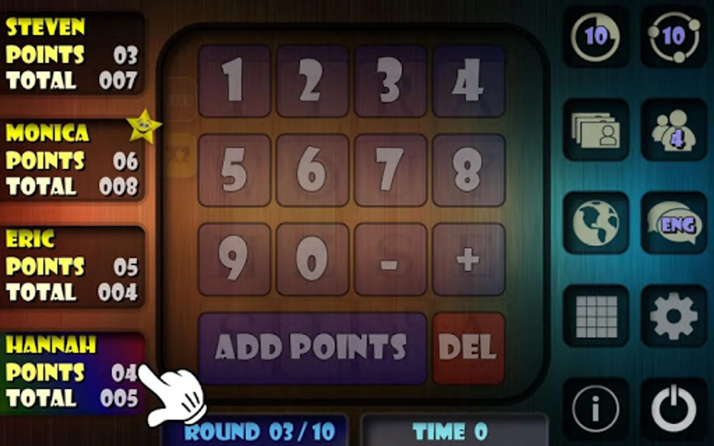 in this game can play from 2 to 4 players or teams at the same time, with only a control device, for add points and control the options.