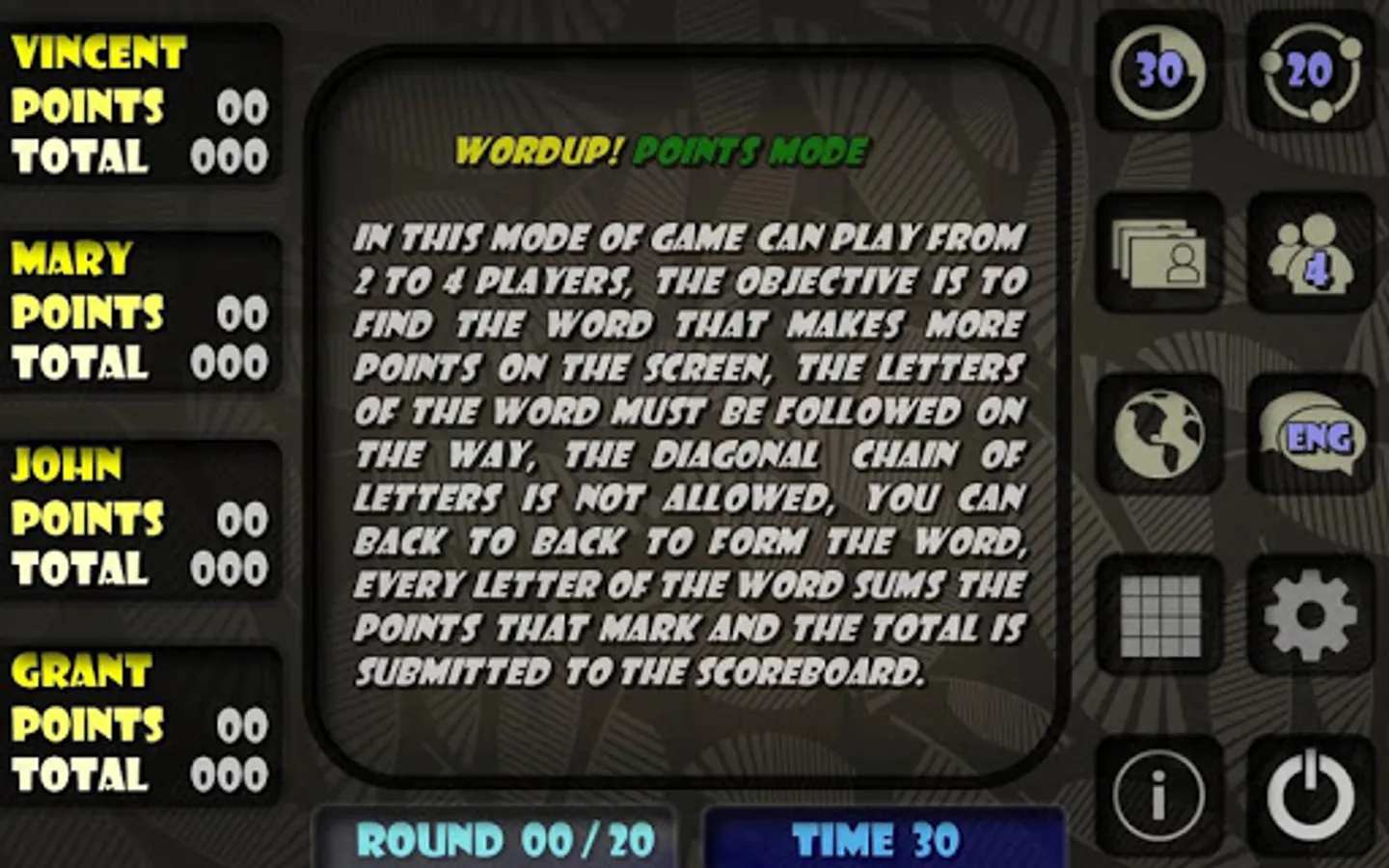 The objective of the game is to find the word that makes more points, more words found or the longest word (Depending of the game mode selected), the letters of the word mus be followed on the way, the diagonal chain of letters is not allowed, , you can return to back to form a word (the game rules can be adjusted at your own taste).