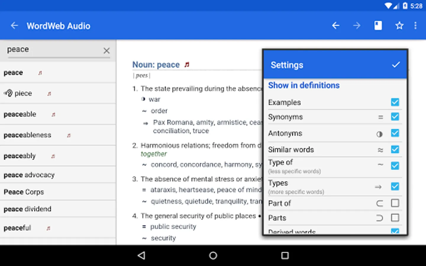 No Internet connection is required to use WordWeb once installed. It requires about 280MB of space on your SD card.