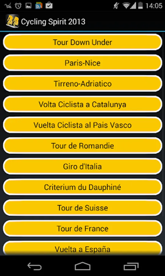 - With Cycling Spirit 2013, try to win stage events like the Tour Down Under, Paris-Nice, Tirreno-Adriatico, Volta Ciclista a Catalunya, Tour de Romandie, il Giro d'Italia, Le Tour de France, Le Criterium du Dauphiné, Vuelta a España (Tour of Spain) or even the Tour of Beijing...