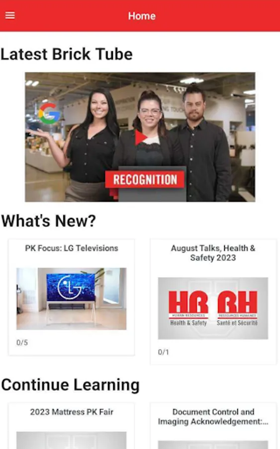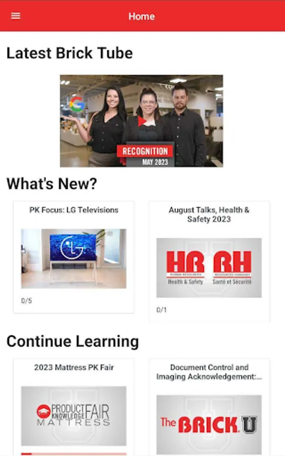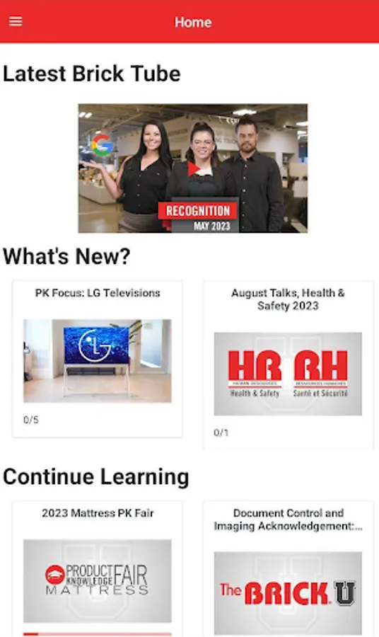 This learning app for employees of The Brick/LFL will give you access to everything you need to know, complete, learn and view to succeed at The Brick. Get access to courses, Brick Tubes, job descriptions and opportunities across the country. Keep track of your completions, courses that are in progress, and what’s due right now. Always have access to the latest released content in the palm of your hand.