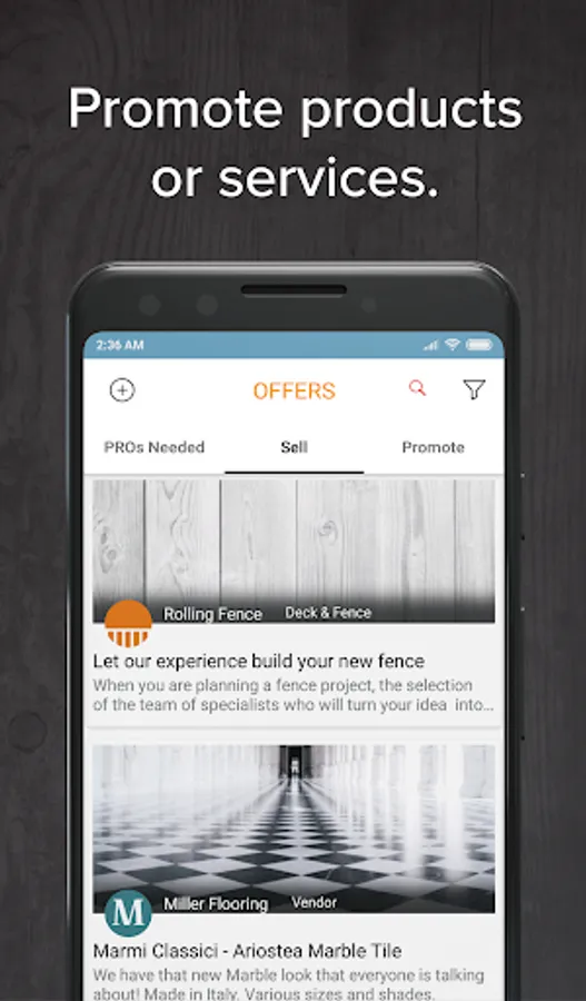 • OFFERS: find and hire pros for a project or list materials for sale.