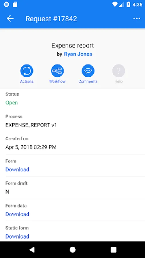Go to a request's follow-up to access all request information in its current status: request data, actions history, actions to do, associated actions, attachments, web form static view, chat-style comments, workflow view, graphical follow-up, help, etc.