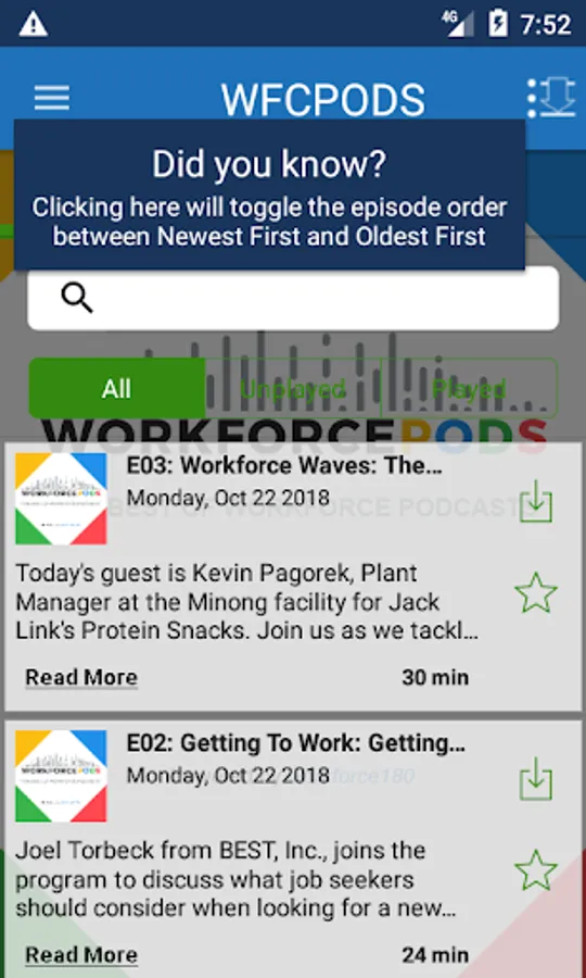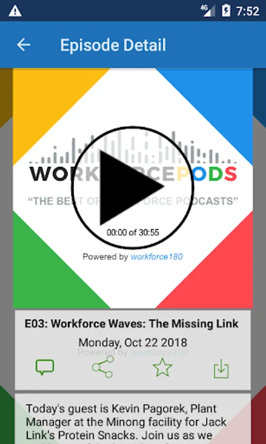 This is the most convenient way to access WORKFORCEPODS on your phone. With this app, you are always connected to the latest episodes and the show. You can also star your favorite episodes and save them to a list so you can easily enjoy them over and over! This app is complete access to WORKFORCEPODS and if you're a fan of the show you won't want to be without it!