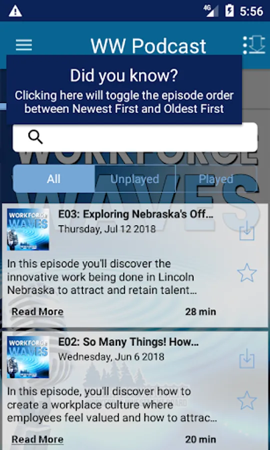 This is the most convenient way to access Workforce Waves on your phone. With this app you are always connected to the latest episodes and the show. You can also star your favorite episodes and save them to a list so you can easily enjoy them over and over! This app is complete access to Workforce Waves and if you're a fan of the show you won't want to be without it!