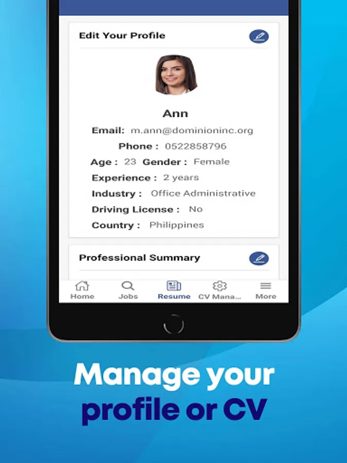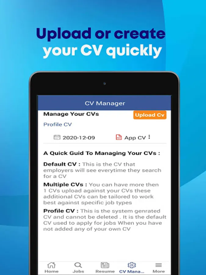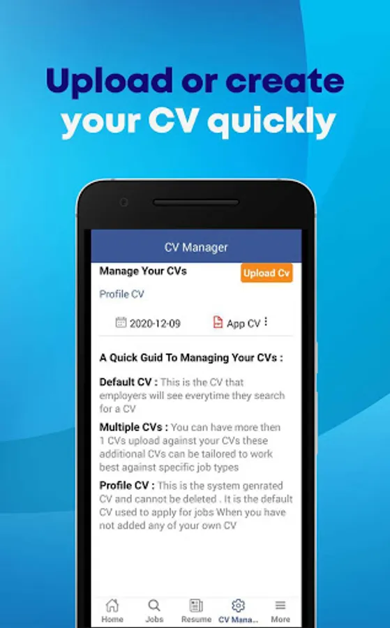- Create/ Upload your CV directly on the app and start applying for jobs you like or relevant to your experience.