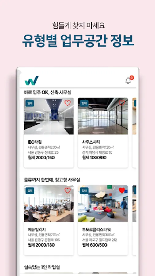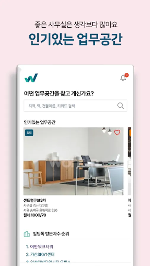 사무실 임대부터 회의실/세미나실 공간대여, 공유오피스 입주, 지식산업센터 분양까지. 모든 업무공간 정보를 한눈에!