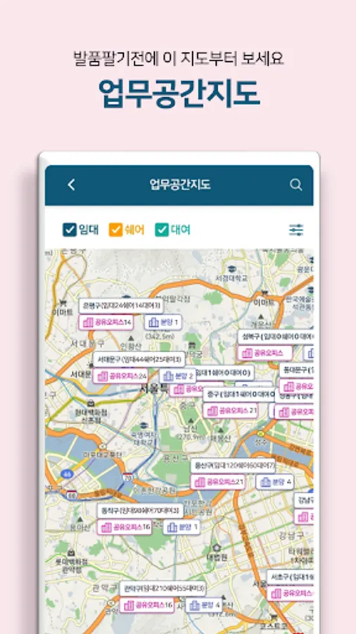 - 지역명 또는 키워드별로 검색, 업무공간지도