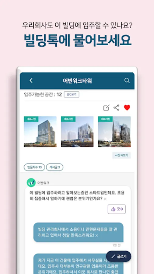 지금 내가 알리고 싶은, 내가 알고 싶은 업무용 빌딩의 빌딩톡방을 개설하세요.