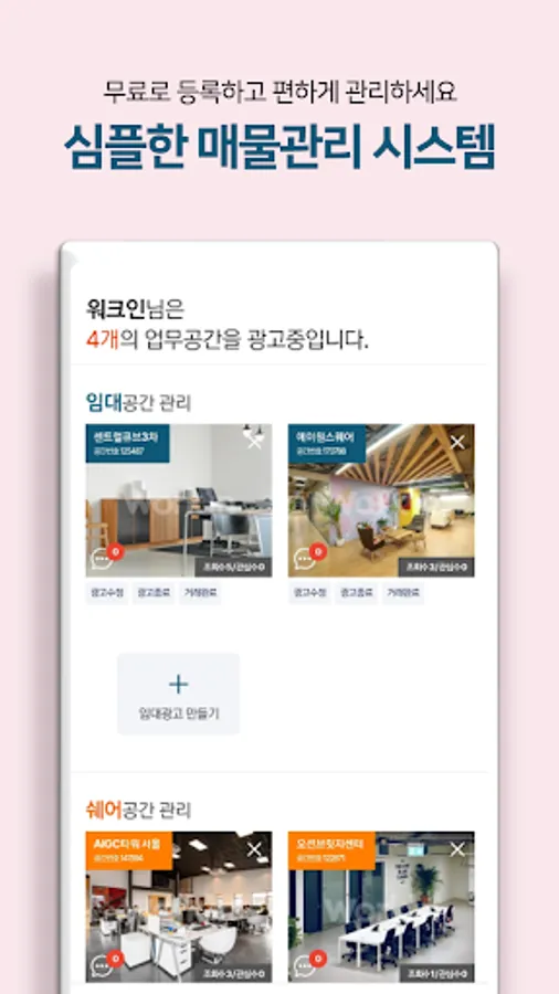 일반회원으로 가입하면 임대/쉐어/대여 방식에 따라 각각 최대 10개의 매물을 동시에 등록할 수 있어요. 거래가 완료된 후 새로운 매물을 등록하는 것에도 제한이 없습니다. 직접 공간을 계약하고 쉐어나 대여 방식을 통해 업무공간을 유연하게 운영하세요!