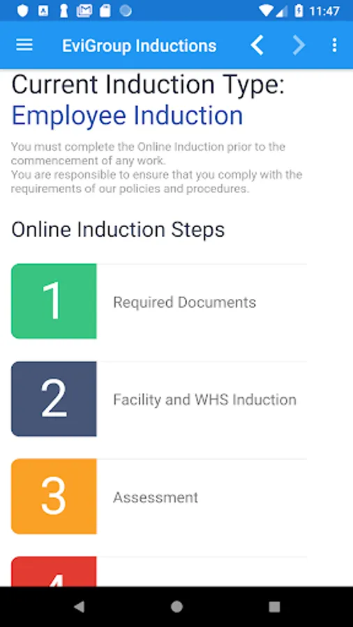 EviGroup Inductions allows users to access and complete their Online Induction material via the app.