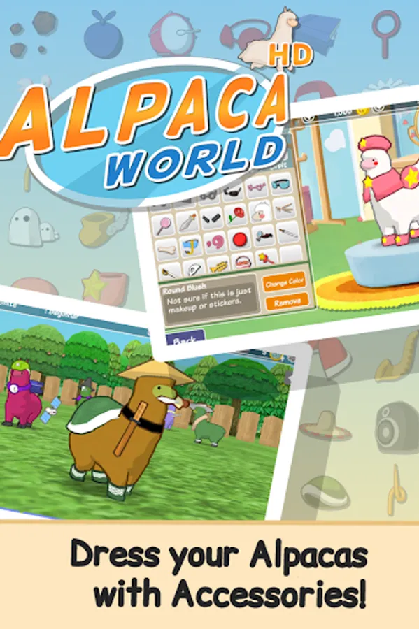You are now an owner of an alpaca farm. Over hundred colors of alpacas are waiting for you. Let's train them, dress them and try to capture more different alpacas that will let you experience unlimited cuteness.