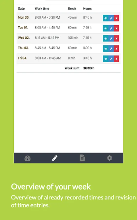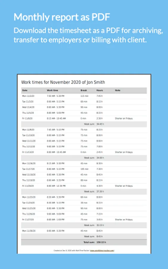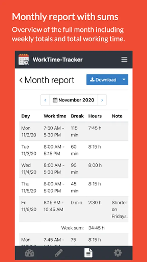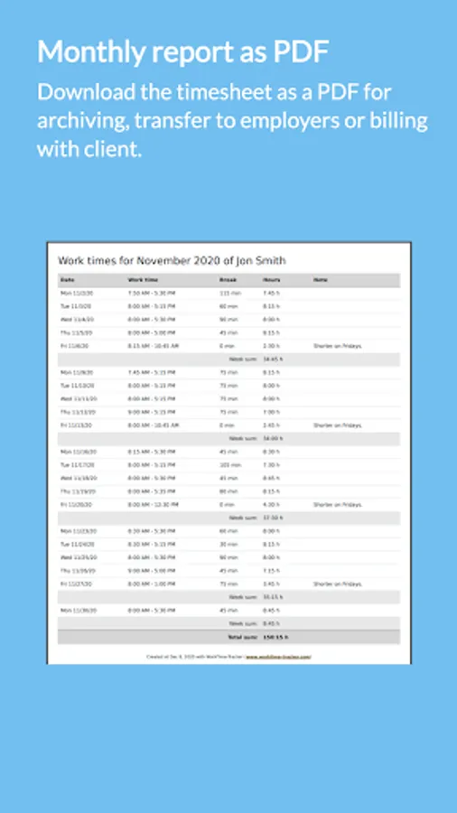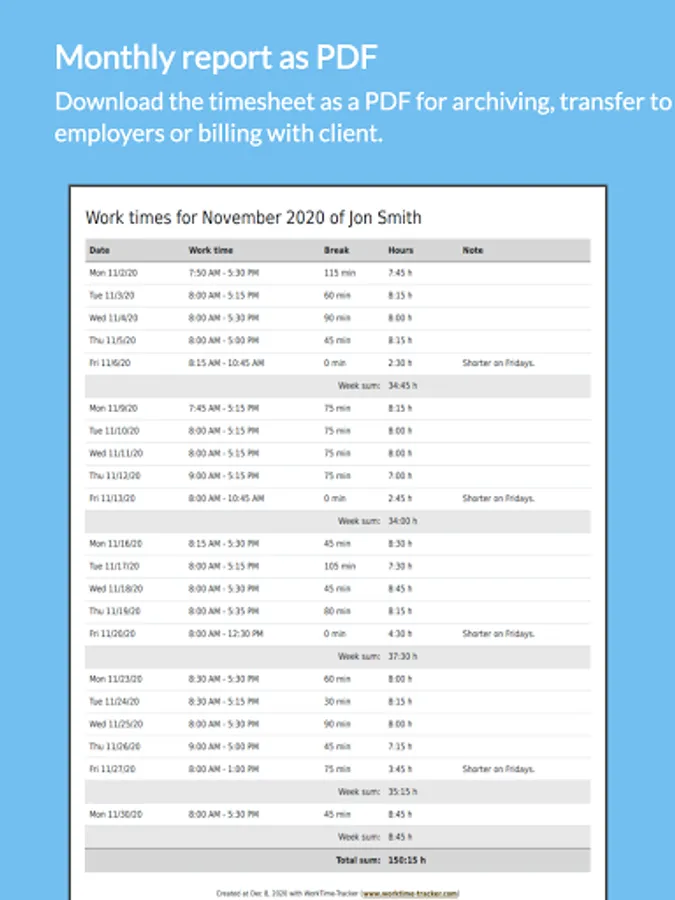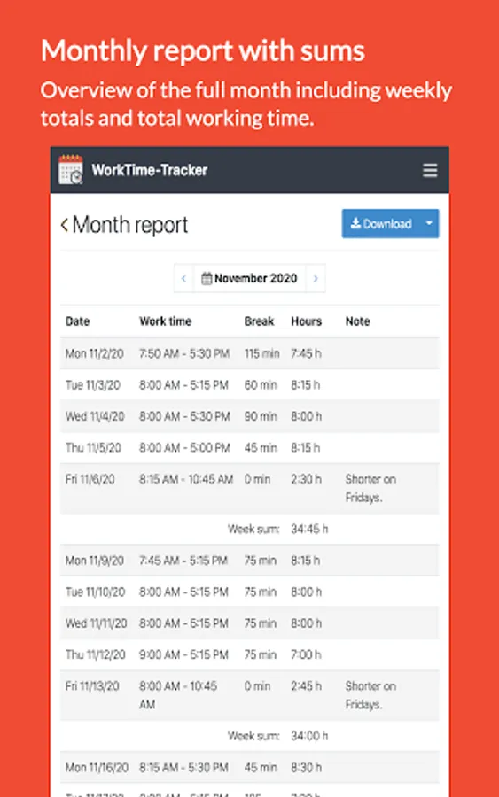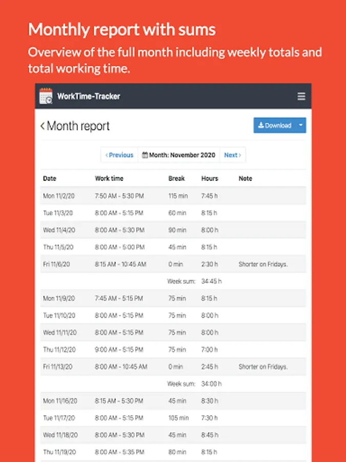 The monthly report with a detailed weekly overview incl. weekly and total sum, clearly lists your monthly working hours and can also be downloaded as PDF.