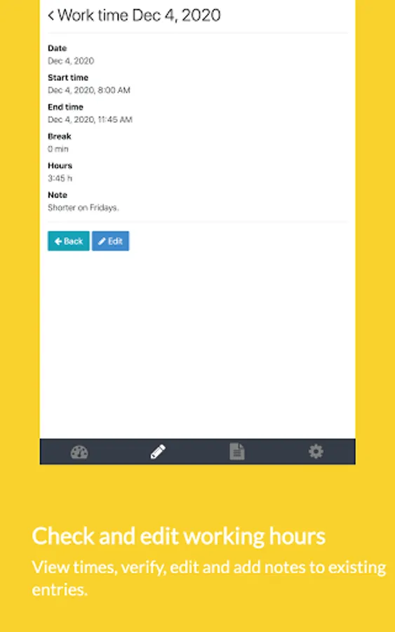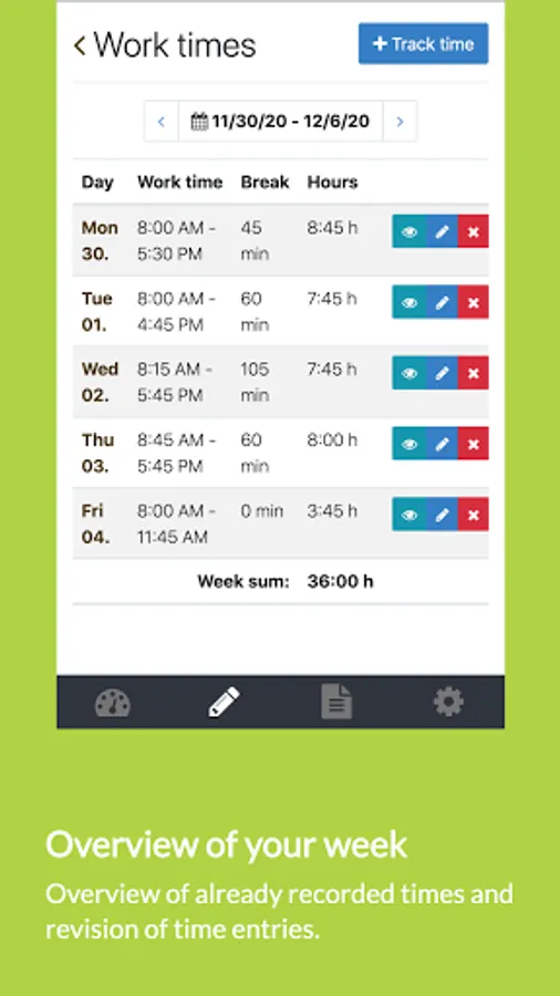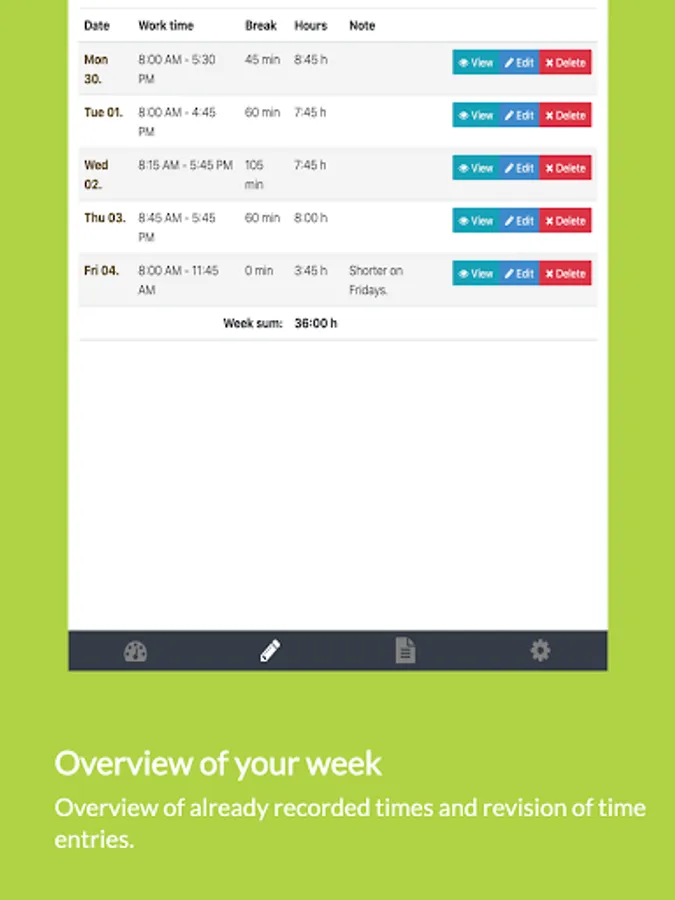 In the week view for manually entering new times, checking or editing existing times, you can add additional notes or quickly and easily create several times in a row.