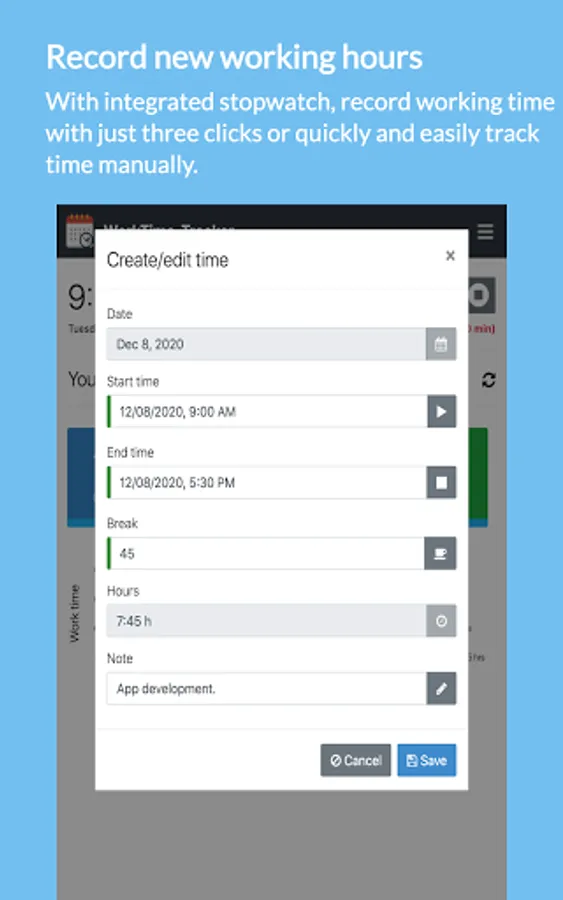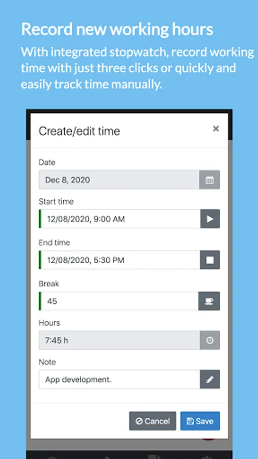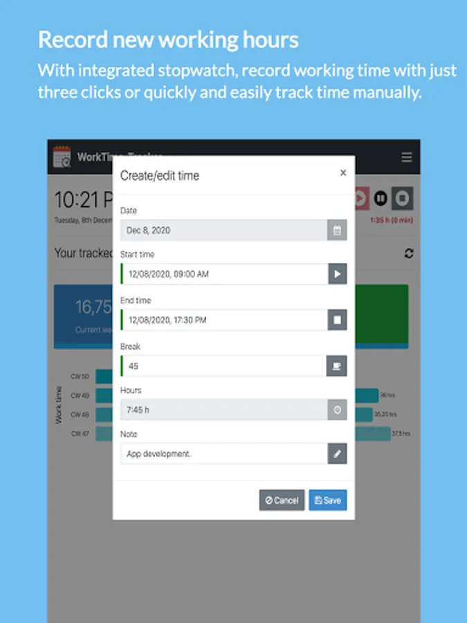 WorkTime-Tracker is the Android app for easy and fast recording of your working hours. Whether you are self-employed, freelancer or employee - thanks to the integrated stopwatch, you can start your daily time recording with just one click.