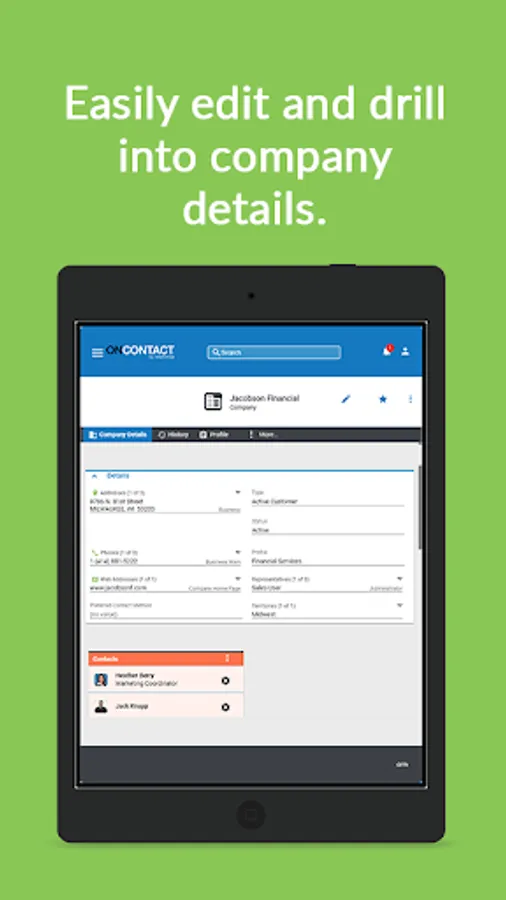 OnContact CRM 10 is a responsive, intuitive application that provides access to your CRM data from any mobile device, so you can work wherever you need to. Our complete mobile application provides anywhere, anytime access to your database of vital customer and prospect information. Check in on company and contact activity history, add new information into the database, schedule activities, and much more, giving you the flexibility to stay productive in your sales, marketing, or customer service role wherever you work.