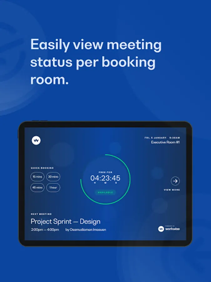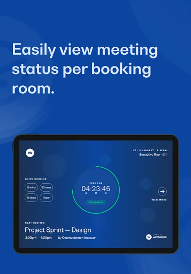 wRooms is a meeting room display app for offices powered by Workwise. You can mount the wRoom app outside your meeting rooms to view room availability at a glance and reserves rooms on the go.