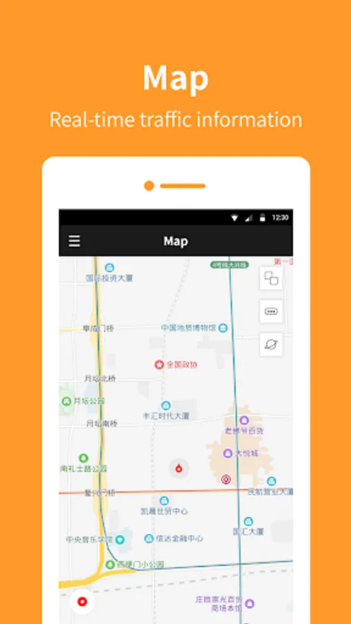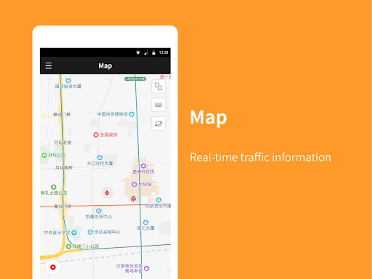 - Support map function, display surrounding traffic information, real-time traffic information, satellite map display