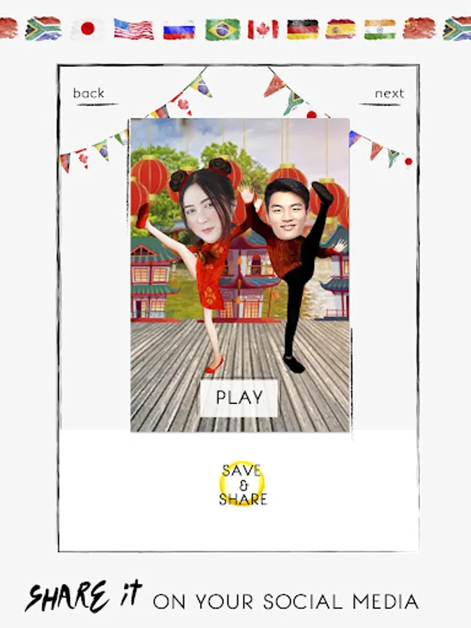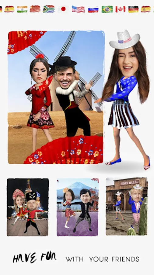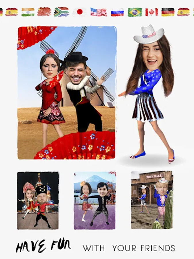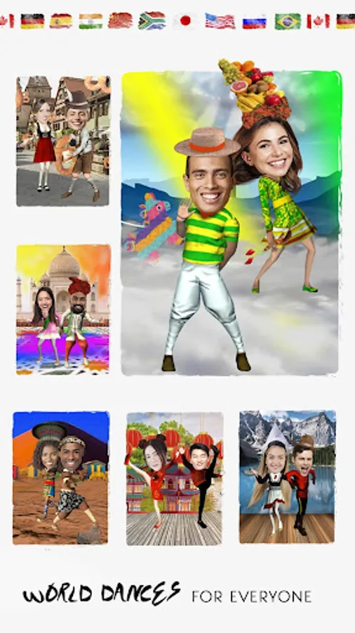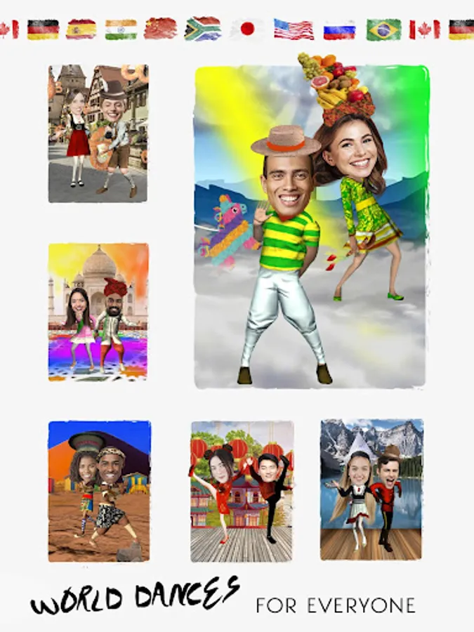 Don't tell us where you are from, just dance with us! Download now and place your face in our traditional dance gif animations to celebrate your favorite dances from all over the world with iconic traditional songs! It's everything you love about your favorite countries. We packed the app with the best traditional dances and songs. It's time to dance yourself with your favorite songs from your favorite countries. Create your own gif dance video with your friends!
