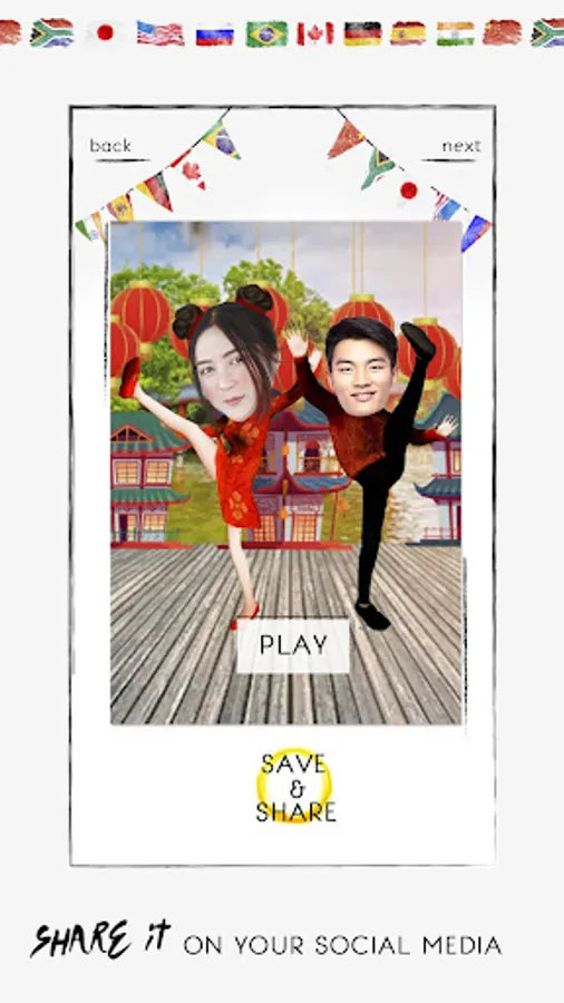 All you need to do is to choose the country that you like and put your face in 3D in these hilarious gif dance animations. You can dance alone or you can dance with whoever you want! Create your funny gif dance video and share it with your friends. They will be crazy in love with your gif dance videos. Enjoy the best and funniest dances of all time from all around the world. The world is yours!