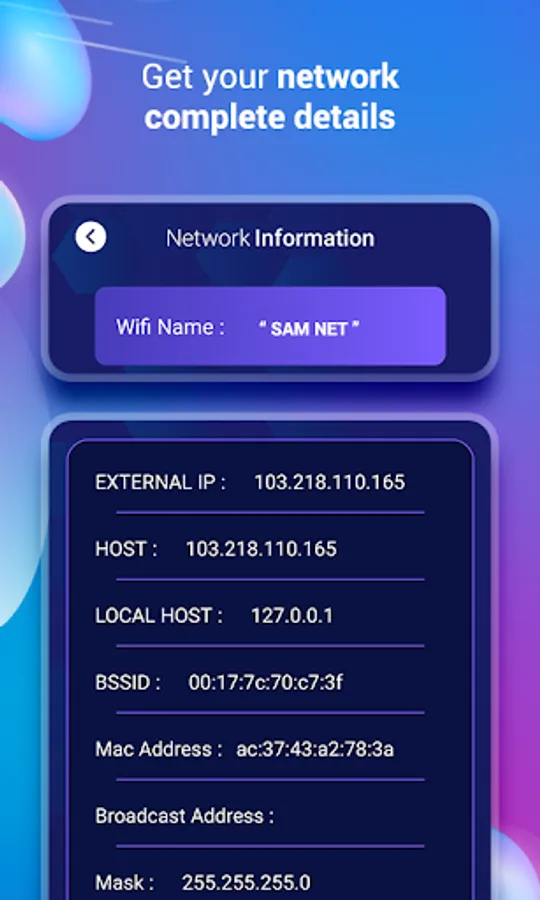 - Display data for - WiFi name, External IP, Host address, Local Host, BSSID, Mac Address, Broadcast address, Mask, Gateway, etc,.