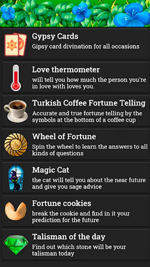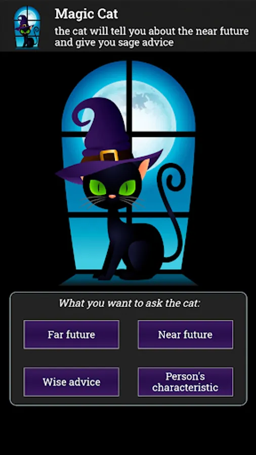 The Magic Cat is a divination in which a wise cat will give a small prediction on one of the questions of interest. The near future, the distant future, sage advice, or a characteristic of the person with whom you are going to build a relationship.