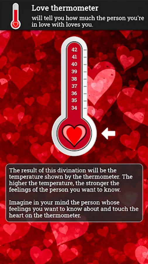 The love thermometer is a quick and simple divination that will tell you how much a particular person loves you. The thermometer will show the temperature of love and give advice on what to do in this case.