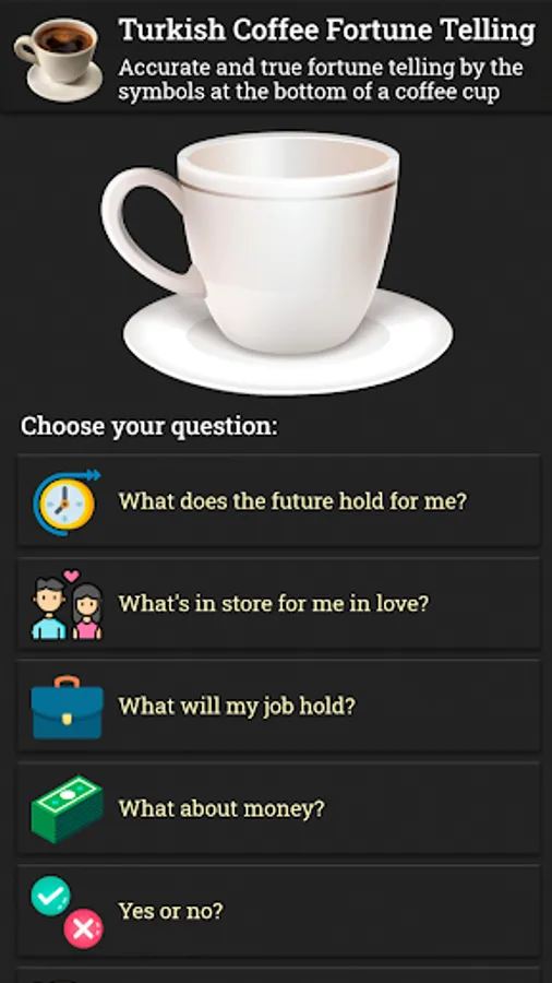 Turkish coffee divination is an old and tried way of predicting what is to come. For fortune telling you need to pour and drink your coffee. The result will be a drawing at the bottom of the cup. You can get a prediction on one of several questions: