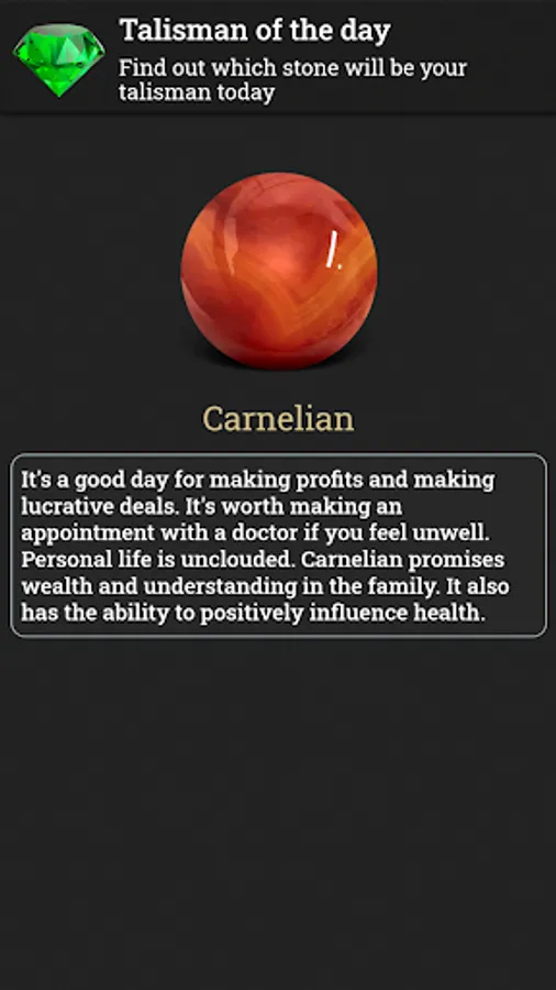 The talisman of the day is a prediction for every day. You need to open the chest and take out a gem, which will be your talisman for the day. Stones have various useful properties that improve your mood and give you energy for the whole day.