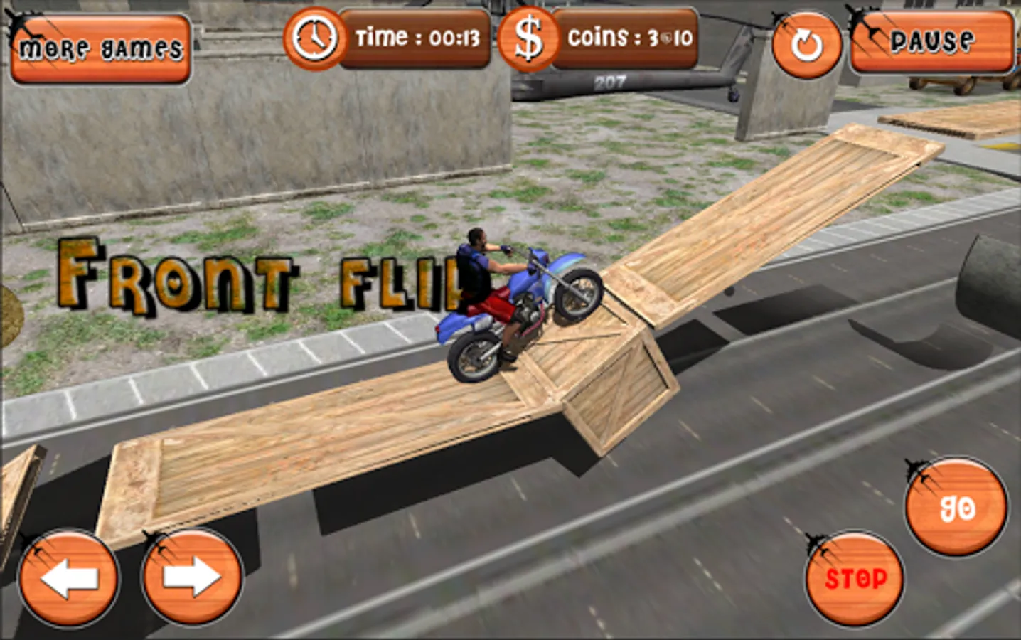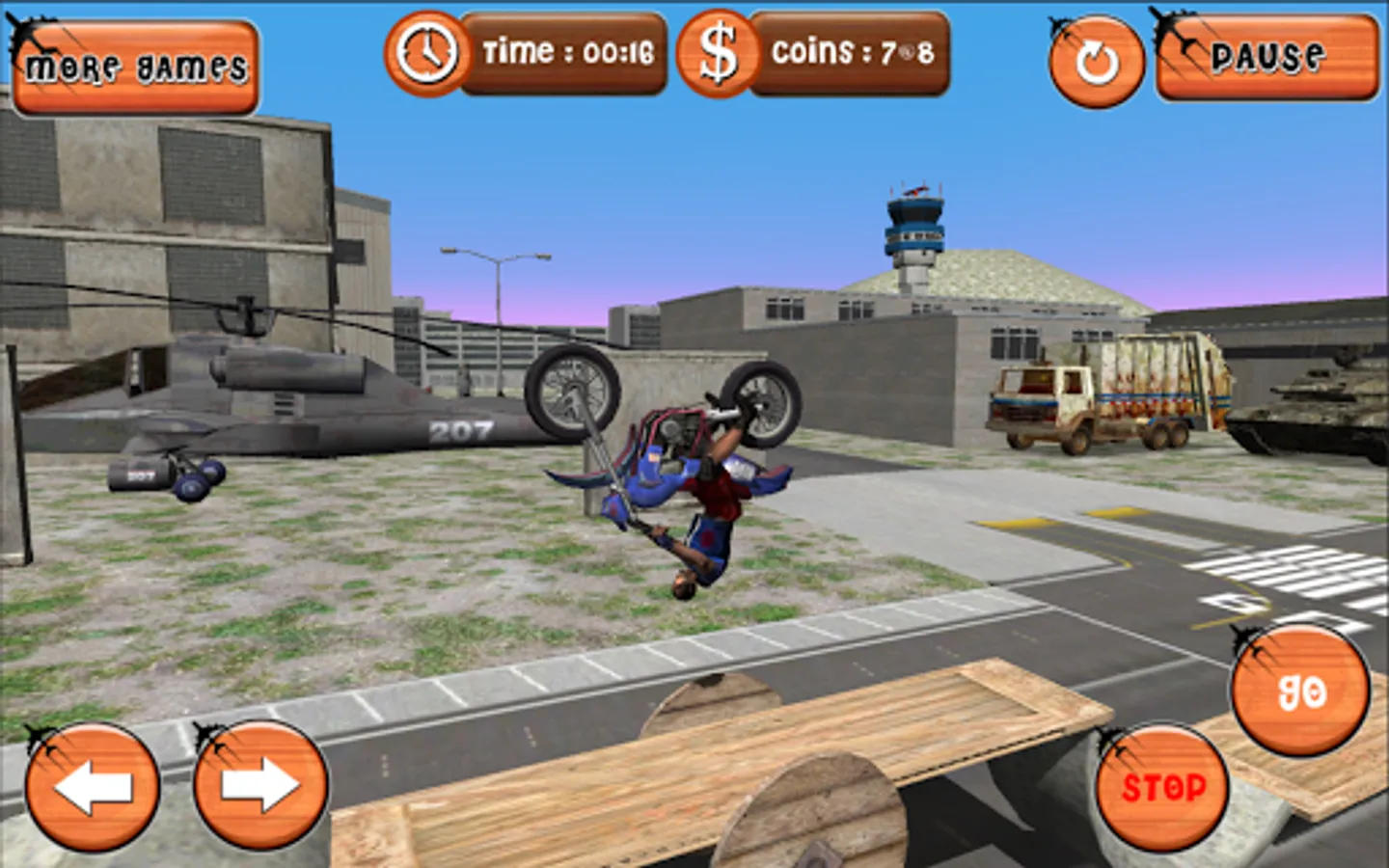 Welcome at the Airport. Bring away your luggage and jump on your trail bike to race the airstrip while doing stunts around the runway and avoid the planes! This cool trail simulator game has 10 missions and is packed with racing action around all kinds of aircraft's included Helicopters, Jets, Tanks and other airport cars and vehicles. Race among the terminals and avoid obstacles, passengers and even the airport staff and pilots! Become no.1 and unlock new levels and gain money to buy upgrades in the motor store for even faster driving. You can upgrade your tires and engines but you can also buy new motorcycles with different paints and specialties. Can you handle this trail extreme motocross simulation and become a real dare devil? Conquer the 3D physics and drive as fast you can to the finish line, collect all coins on the circuit for a higher score that you can use in the shop. So hop on your motor and use your steering skills while driving around the airport and taking control of it by doing awesome thrill tricks! So save money to buy expensive rides and conquer the road while doing a crazy ride full of adrenaline competition. Avoid collisions and enjoy this free sports game challenge with cool and realistic 3D graphics that will win your hart and give you hours of gaming fun.