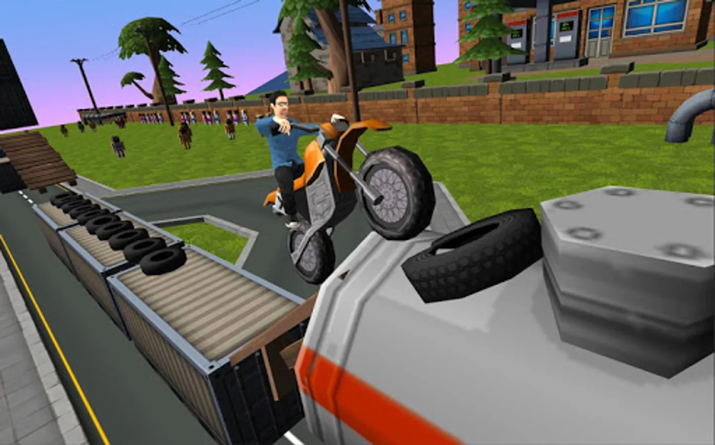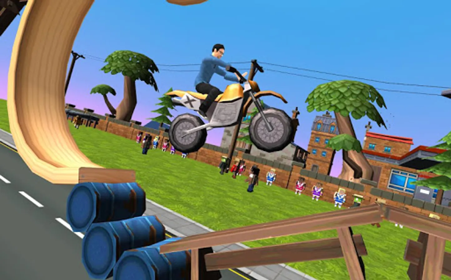 Jump in the world of Cartoon Dirt Bike! Race and stunt over all kinds of objects in this cool 3D cartoon graphic game. Can you handle the fast motorbike you are driving and make a perfect score? Do not crash in front of the crowd around the track and try to finish every level before 1 min and get extra stars for that. Jump over barrels and use loops to get a higher platform so you can do the coolest stunts! You even jump over big gas tanks and containers! Look very careful at the track because some levels has more then 1 way to go.