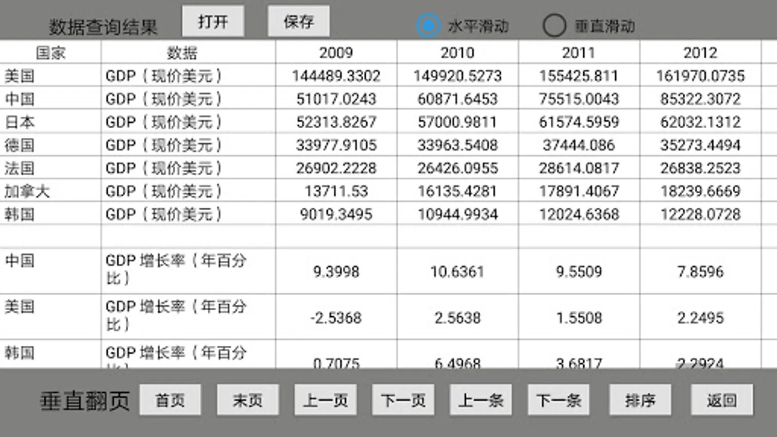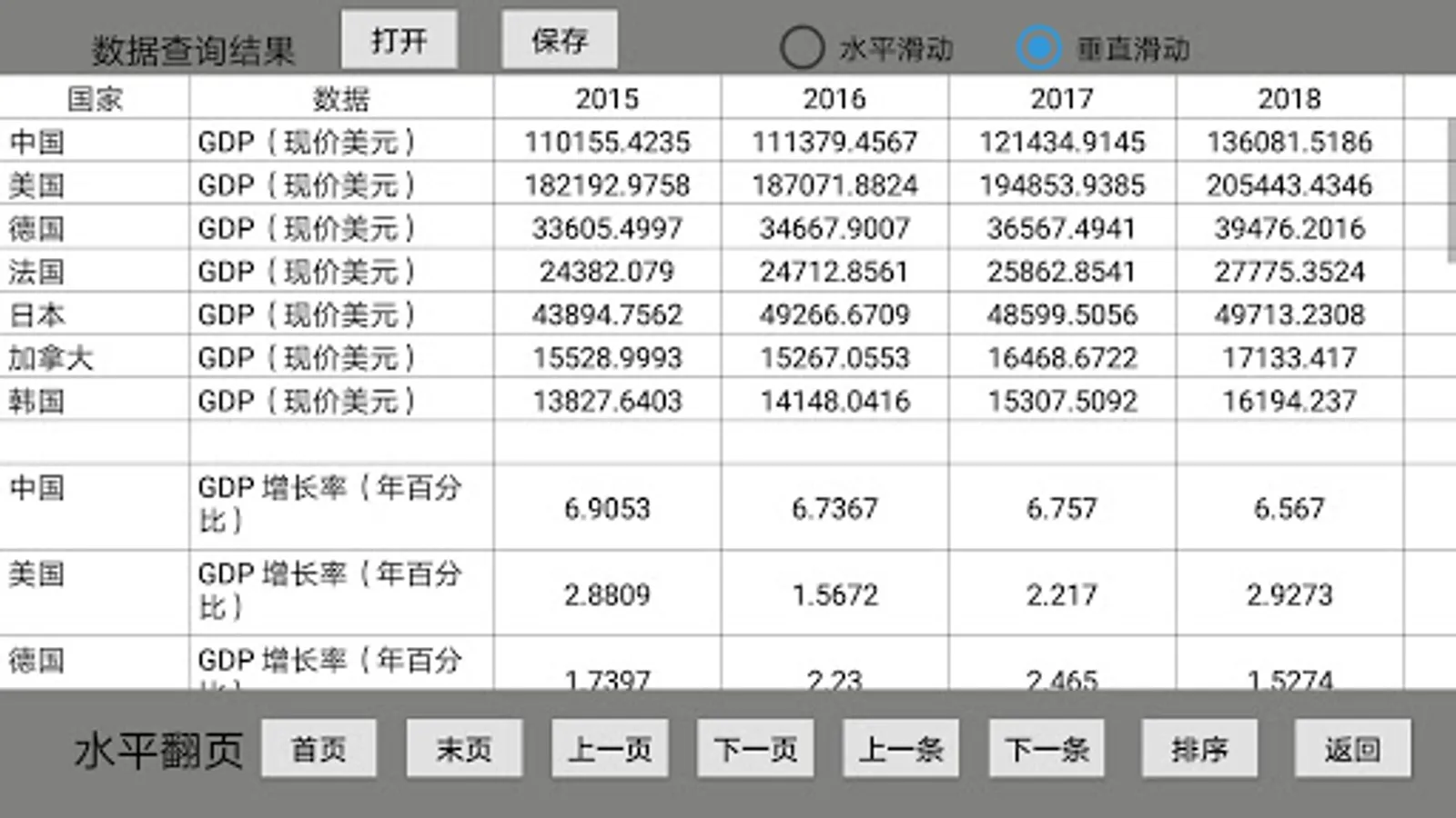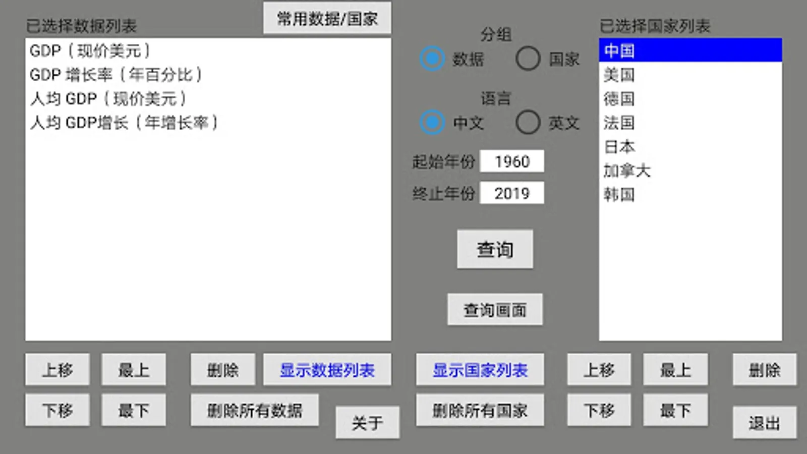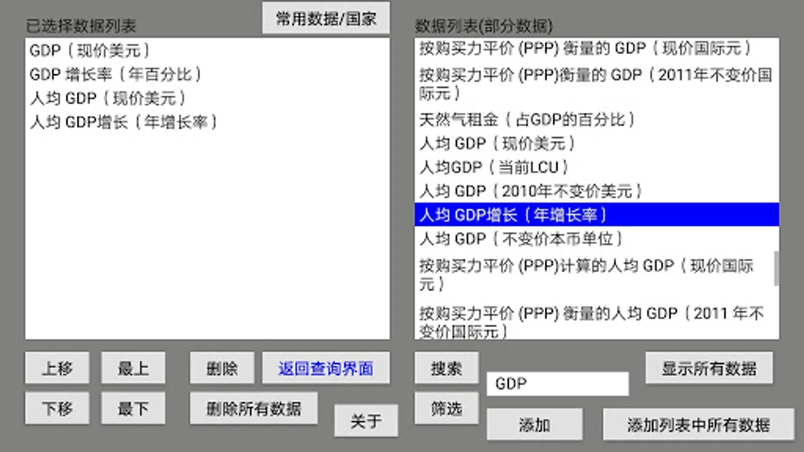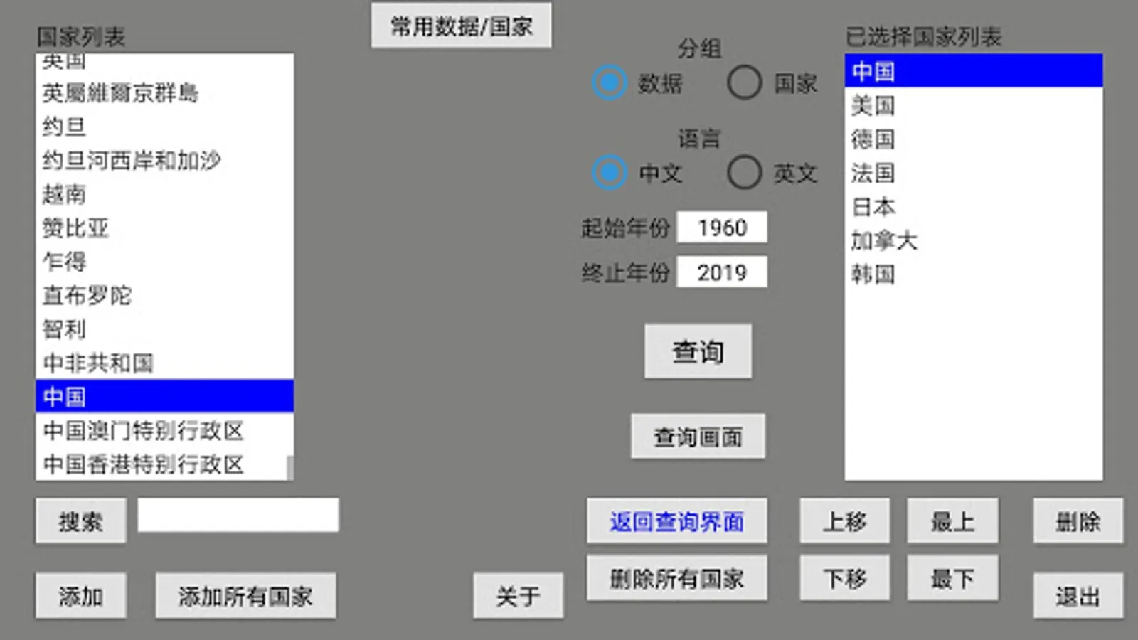Through this application, you can query all the data from the World Bank statistics from 1960 to 2019, and archive them, and call them at any time. The statistics include 1429 items of data from 217 countries and regions, such as GDP, debt, power generation, carbon Emissions, PM2.5, population, working capital, export data, import data, taxes, volume of goods transported, consumption expenditure, unemployment rate, etc.