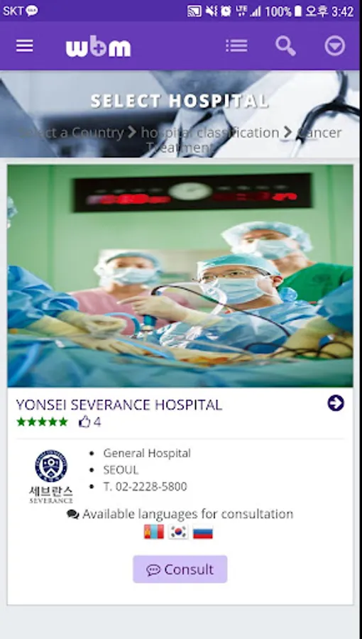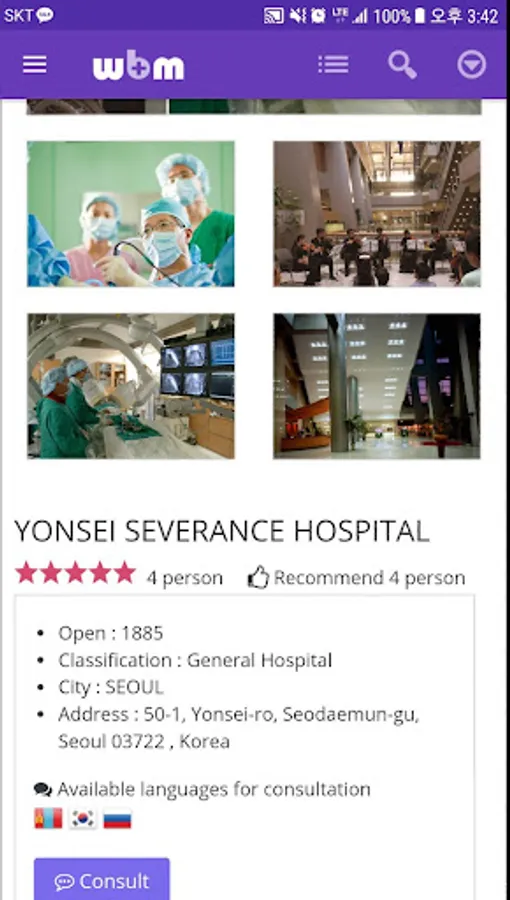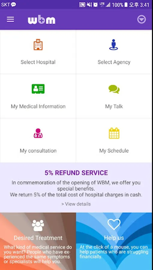 This program is a mobile dedicated program of medical tourism online homepage WBM (worldbestmed.com). Any foreign patient will be able to find well-known medical institutions by disease through WBM, and can consult and make appointments directly with the medical institution without any help. This service is available in five languages: Korean, English, Russian, Chinese and Mongolian.