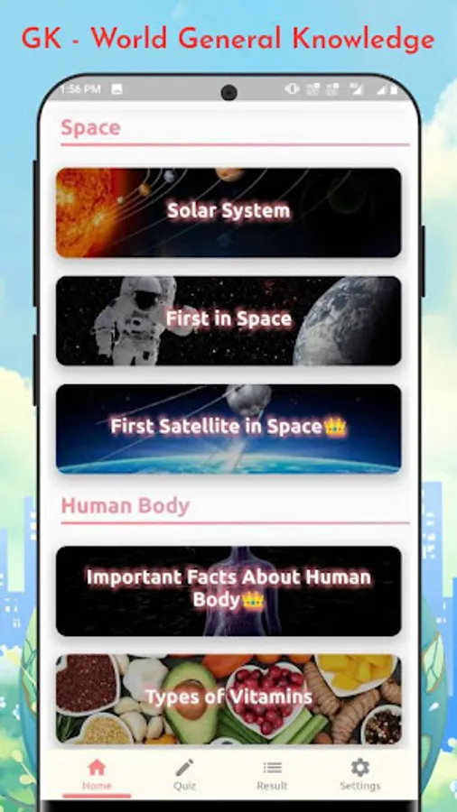 The application consists of different topics related to our world and for each topic there is book for study and quiz to test your knowledge. You can also track your progress on each topic.