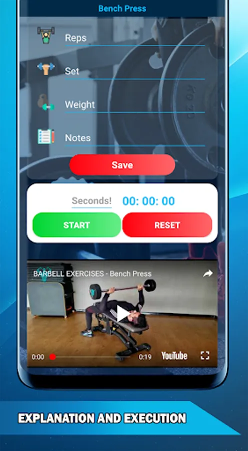 Each Barbell exercise has its respective explanation, illustrative images and an explanatory video, so you can execute it correctly.