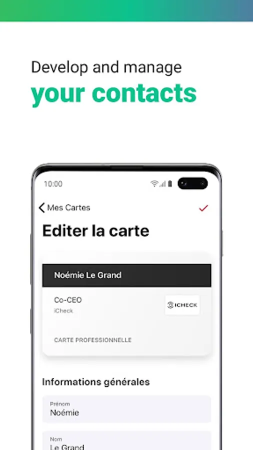 iCheck is an application for creating digital business cards. The business card contains all your information (possibility to add among 63 social networks, Website, Phone number, Email address, PDF document etc...)