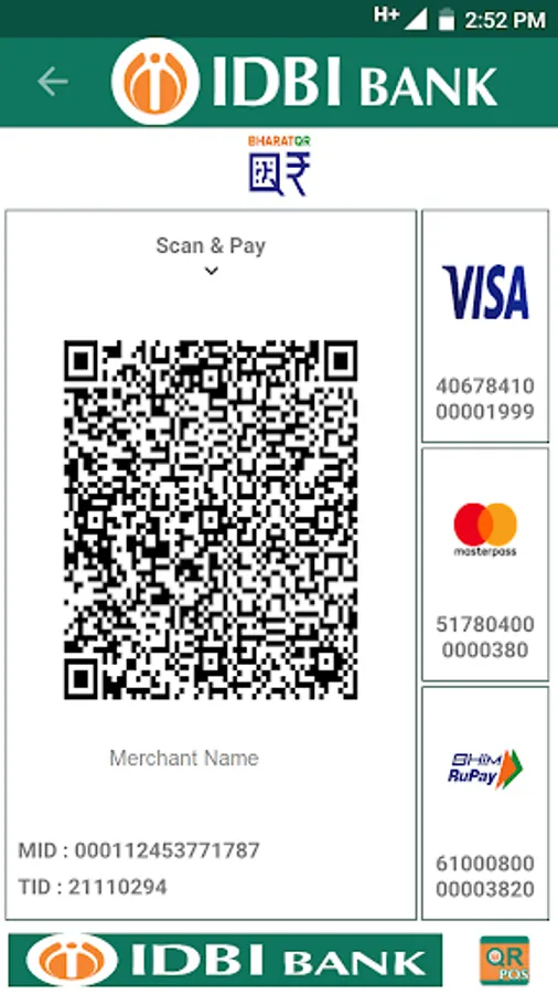 It is Common QR code based Payment Acceptance solution for IDBI Bank Merchants for accepting payment through Bharat QR Code instead of traditional Point of Sale (POS) Machine, Consumer can make hassle free & secure payment through any Bank/wallets App integrated with Scan & Pay through Bharat QR and can opt to pay using Visa/Master/Rupay or BHIM (UPI).