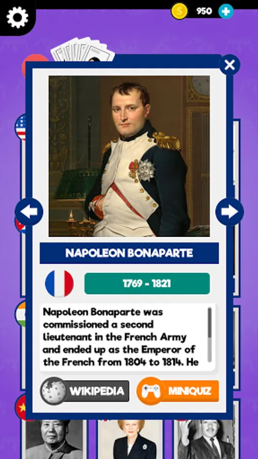 In this Learn Mode you can browse historical leader cards and display important facts, mini biographies and even quiz yourself with a mini trivia about that person! And if you're hungry for knowledge and want to know even more, the app links to encyclopedia for the historical figure you are interested in!