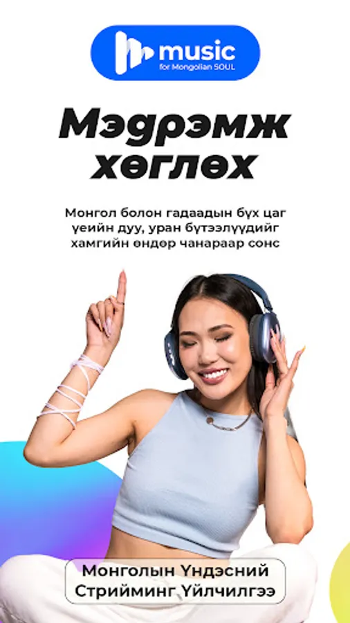 MONGOLIA'S NATIONAL STREAMING SERVICE Mmusic is the only official platform in Mongolia that brings you the works of Mongolian bands, singers and musicians with official intellectual property rights and high sound quality.