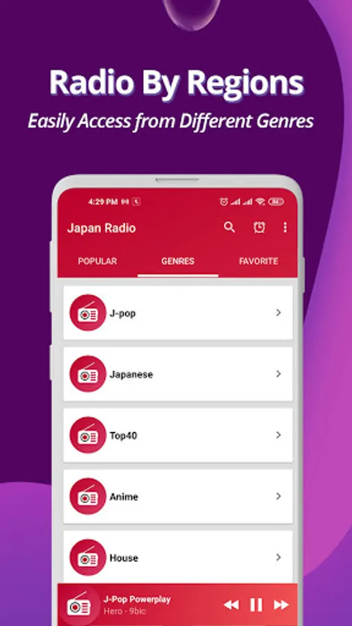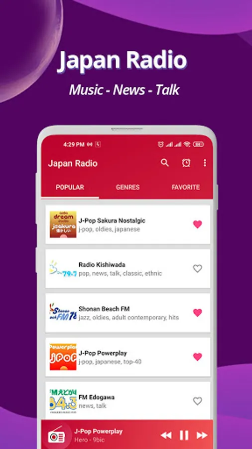 Japan Radio brings you the best 150+ online radio stations from all regions of Japan. This is the radio application where everyone can listen music, audio, news, talk, comedy, entertainment etc from every corner of the world.