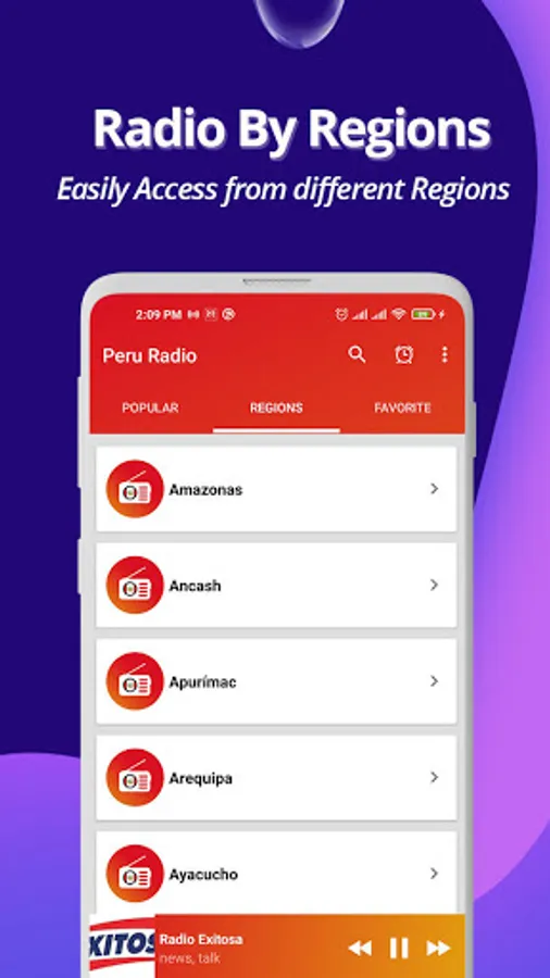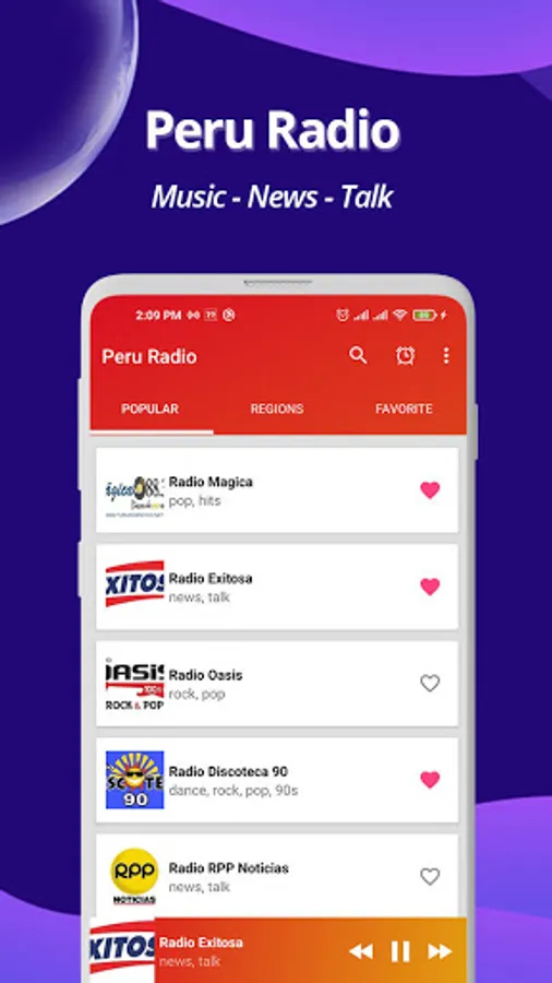 Radio Peru is an android radio application where you can listen different fm online broadcasted from every online radio stations of Peru. It helps you to find different fm online radios in different language as well. Apart from the radio player, this application let you to enjoy with soothing music from different radio so this is also a music player application.